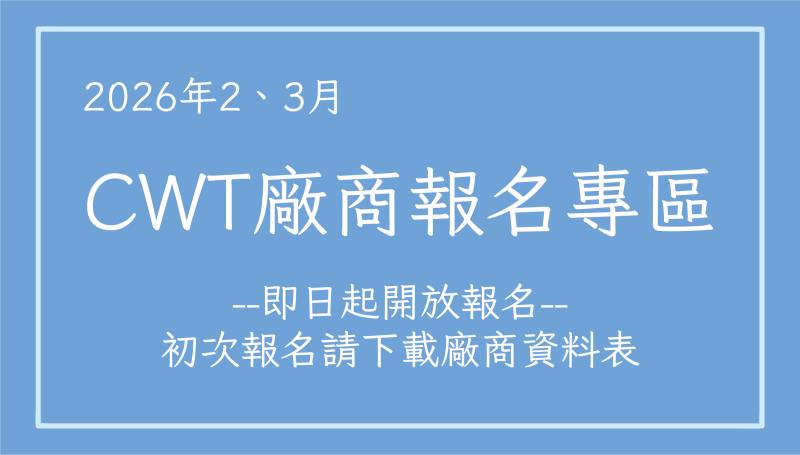 - 目前CWT商業攤位全面採「官網廠商資料表下載報名」請至CWT官網「廠商報名」下載報價單。