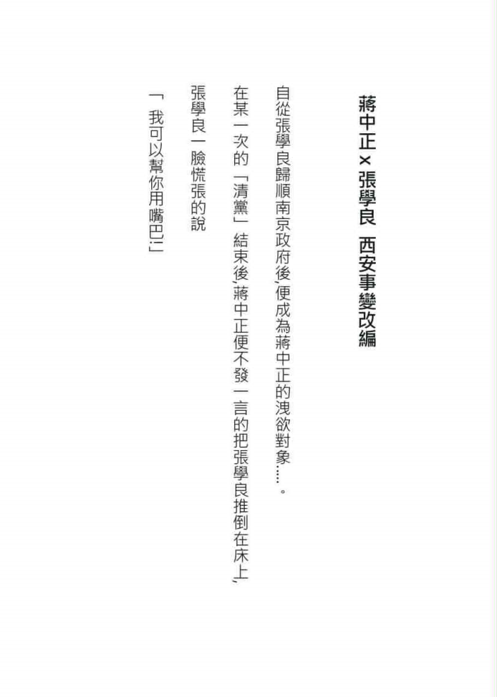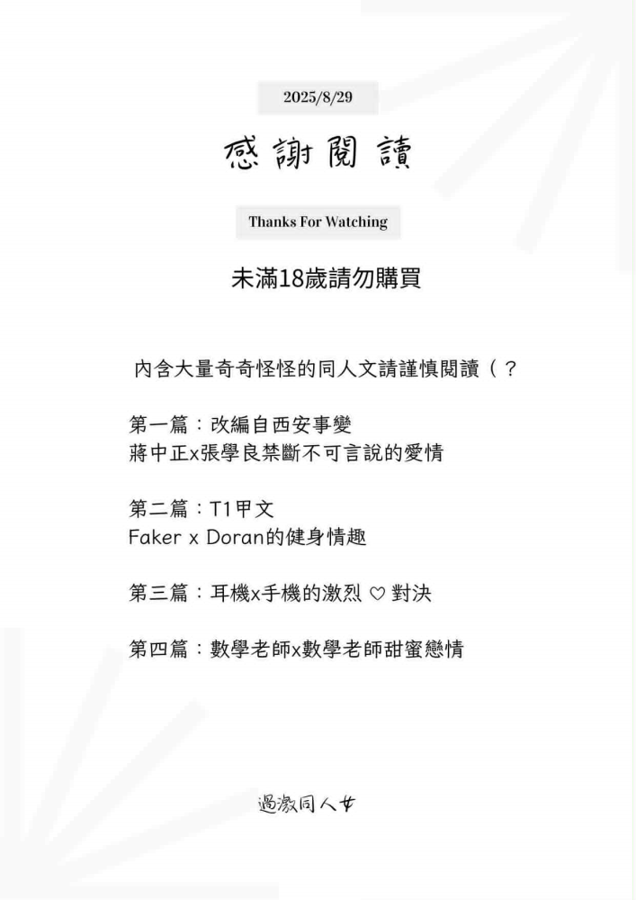 想看蔣中正跟張學良禁斷不可言說的愛恨情仇嗎 想看耳機跟手機這對人外伴侶的激烈對決嗎 還是對T1甲文有興趣呢 歡迎購買過激同人女的同人文合集 還附贈一篇原創數學老師之間的甜蜜故事喔