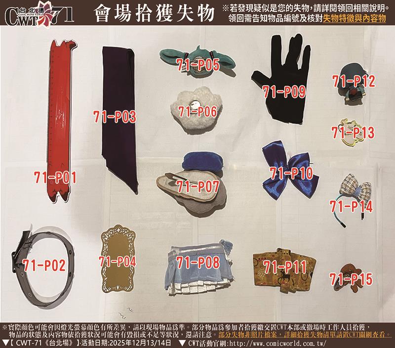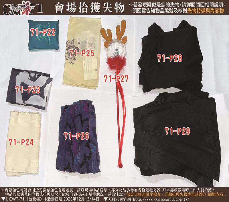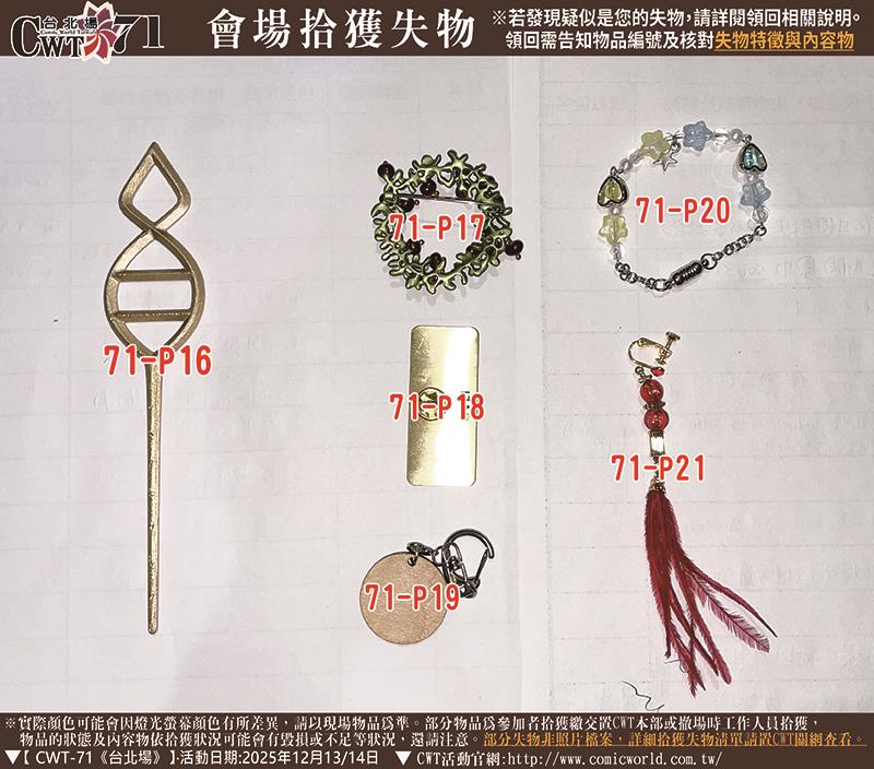 【失物僅保留一年】 若有同好在物品清單及照片中,發現疑似屬於您的失物,請在公告後一年內依規定方式與CWT工作小組聯絡。| 聯絡信箱:CWT@comicworld.com.tw |