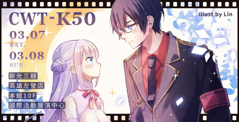 CWT-K50《高雄場》 活動時間│2026年03月07/08日活動地點│新光三越高雄左營店10F國際活動展演中心 活動地址│高雄市左營區高鐵路123號10樓 社團報名時間│10月07日-10月20日社團攤位圖截收時間│10月21日-11月30日活動內容│同人誌販售攤位滿載、等 現場票價│