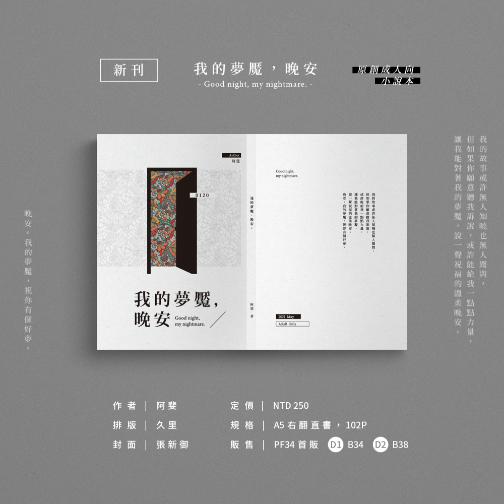 成人向原創小說本 封面設計:張新御 排版:久里 A5右翻本 。內容簡介:主角是一名住在精神病院的患者,每日跟幻覺搏鬥的下場是無止境的打針跟綁縛壓制。 瘋狂之餘,她看到了坐在她床尾的夢魘。夢魘允諾了她的永久的安穩睡眠,條件是必須進入它準備好的夢境裡。 在夢境與夢境相連的當下,主角發現了那不僅僅是夢,更是當下不敢面對的過去反射。 她會勇敢面對撲山倒海襲來的過去,走出夢境,還是甘願沉醉在夢境裡,長睡不起呢? 鑰匙已經插在門裡,端看你要不要打開而已。